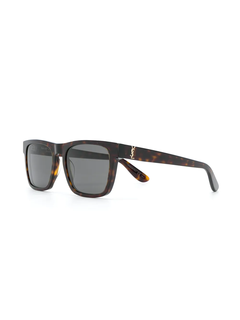 Zonnebril met rechthoekig montuur van Saint Laurent Eyewear voorzien van gekleurde glazen, goudkleurig logo plakkaat, schildpad effect en gestrekte armen met hoekig uiteinde.