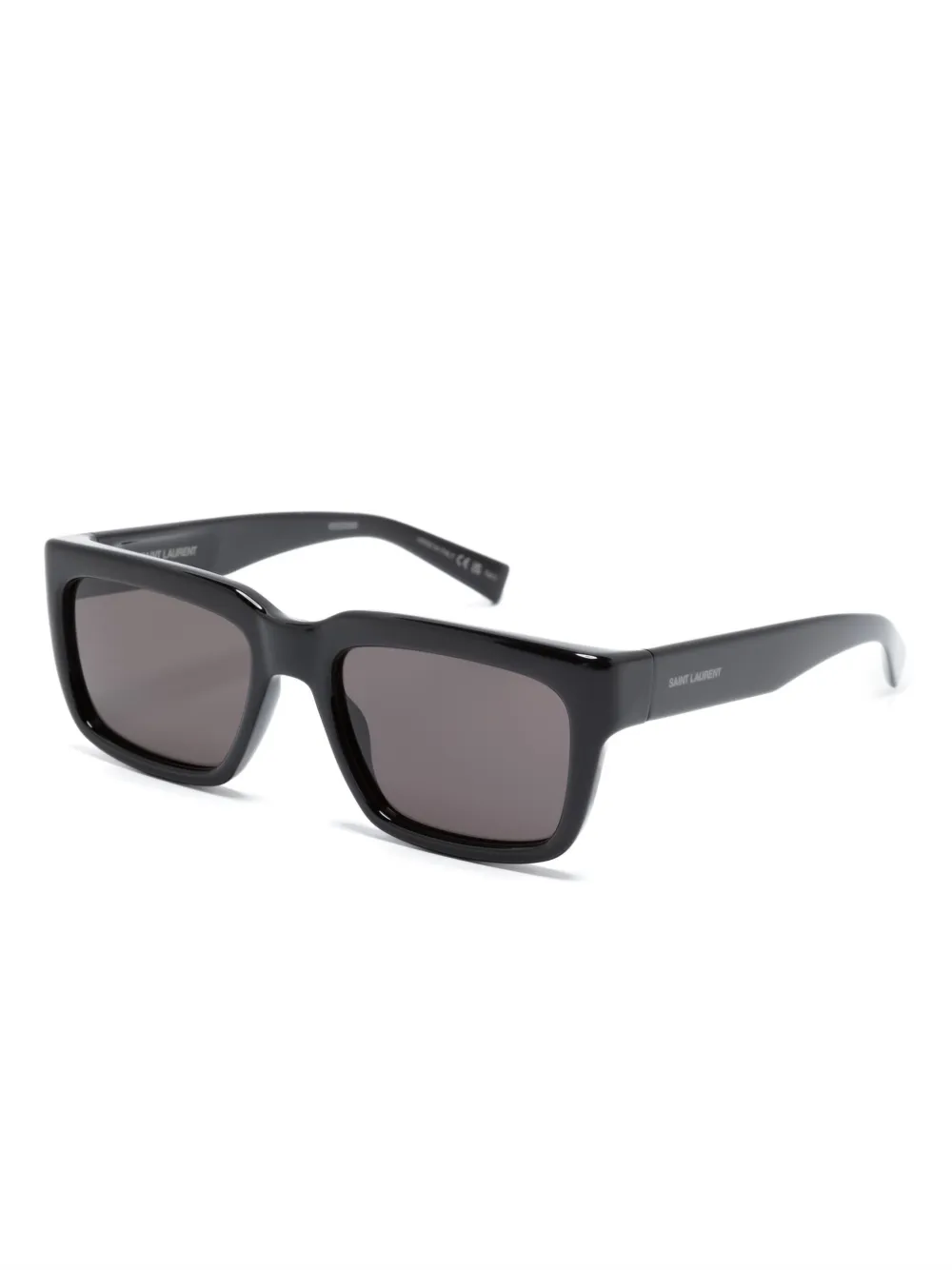 Zwart, acetaat, glanzende afwerking, rechthoekig montuur, gekleurde glazen, glazen met UV-bescherming, logoprint op het pootje, rechte pootjes en gebogen uiteinde. Deze bril wordt verkocht met een beschermhoes..
