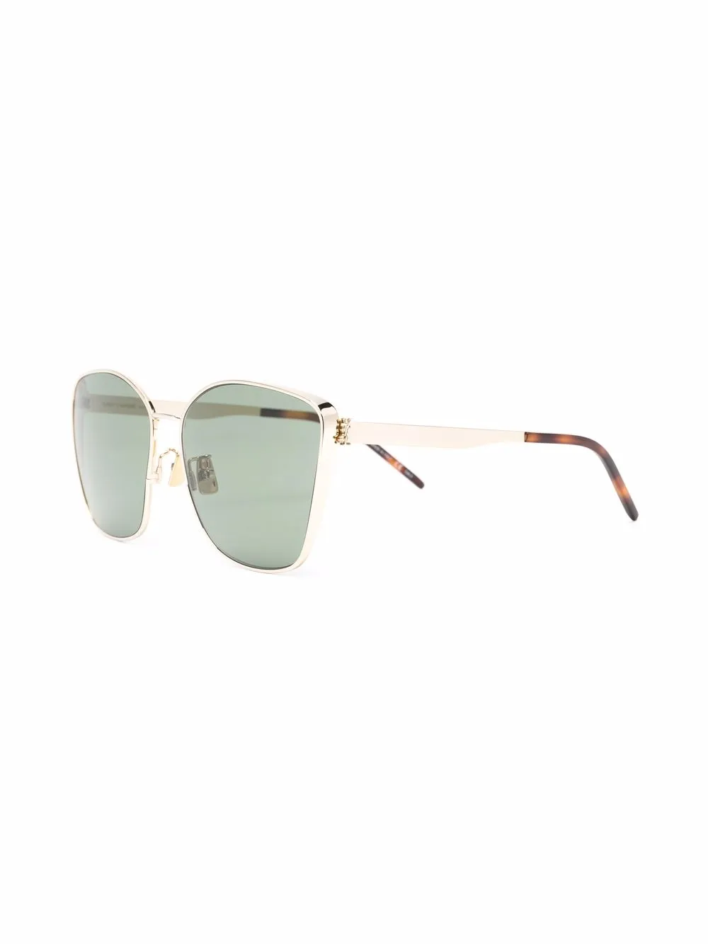 Goudkleurig materiaal, vierkant montuur, grijze glazen, neuskussentjes, rechte pootjes en gebogen uiteinde. Deze bril wordt verkocht met een beschermhoes..