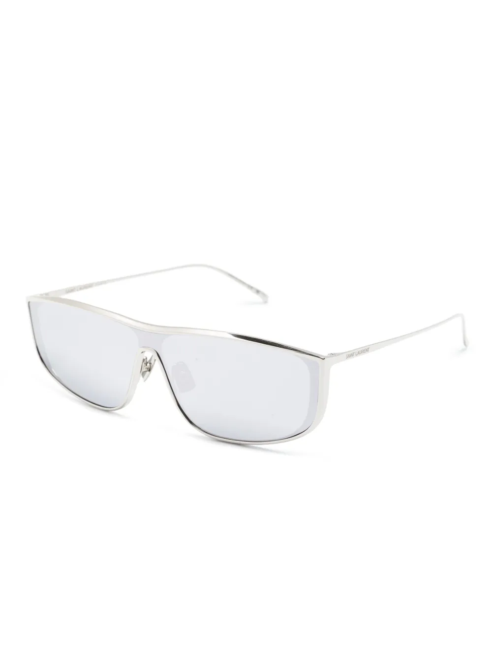 Zilverkleurig, titanium, grijze glazen, logo bedrukt pootje, vierkant montuur, rechte pootjes en gebogen uiteinde. Deze bril wordt verkocht met een beschermhoes..
