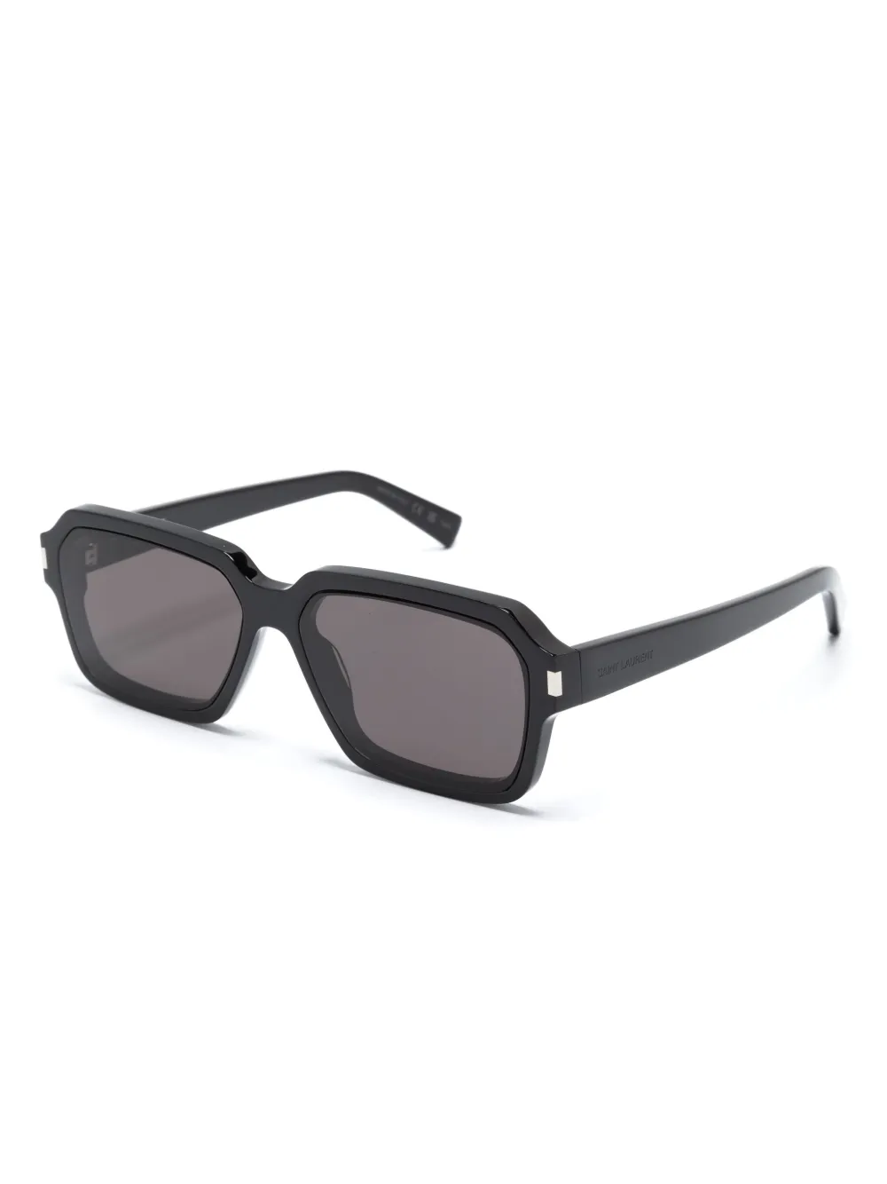 Zwart, acetaat, pootje met gegraveerd logo, vierkant montuur, grijze glazen, rechte pootjes en gebogen uiteinde. Deze bril wordt verkocht met een beschermhoes..