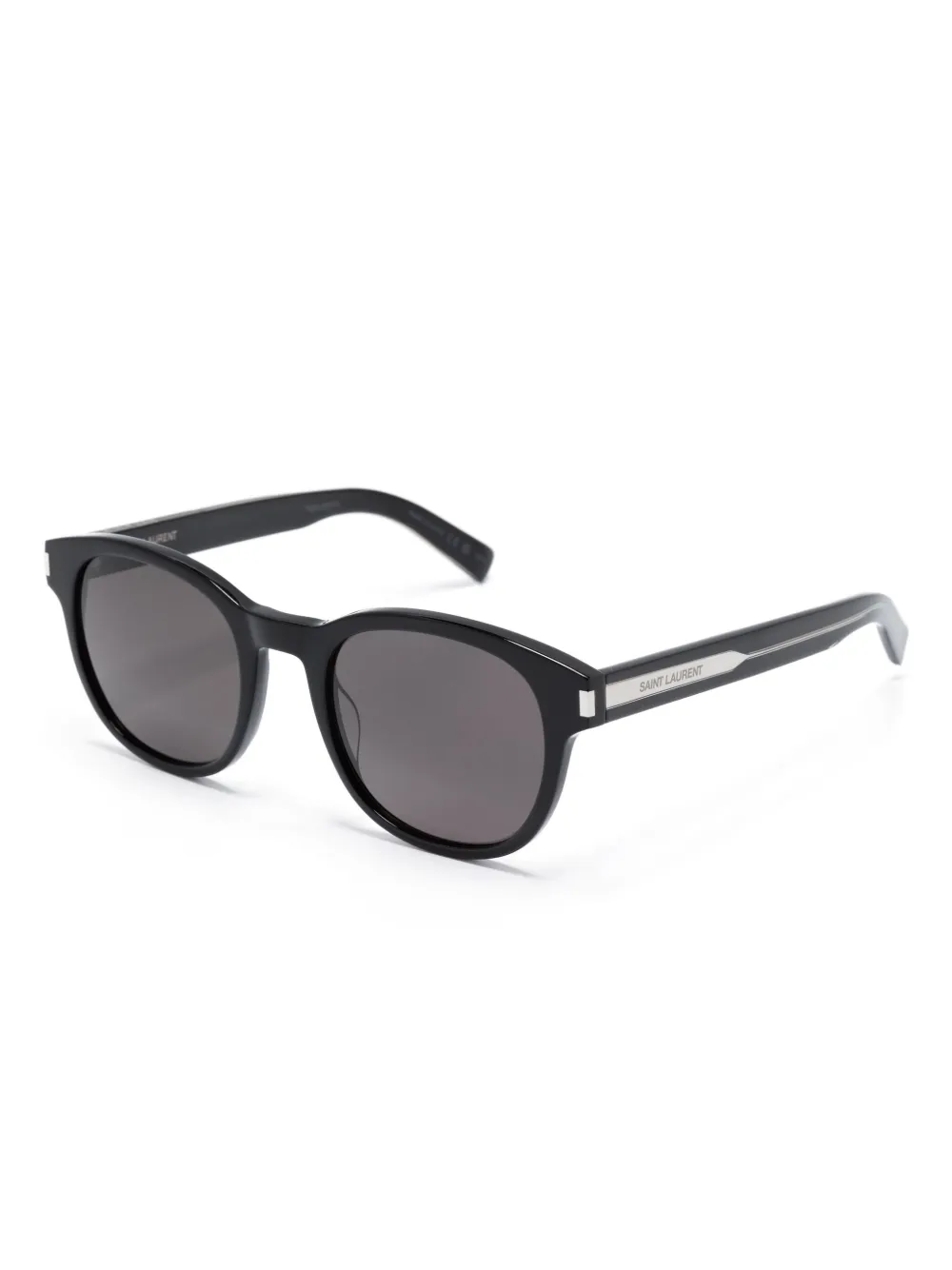 Gitzwart, acetaat, pootje met gegraveerd logo, vierkant montuur, grijze glazen, glazen met UV-bescherming, geschulpte pootjes en gebogen uiteinde. Deze bril wordt verkocht met een beschermhoes..