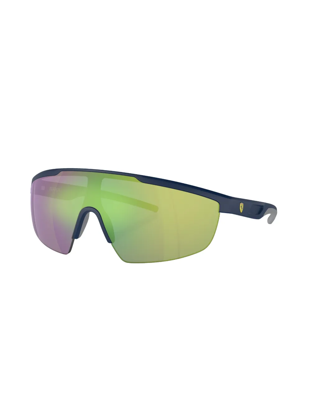 blauw shield montuur gekleurde glazen pootjes met gegraveerd logo gebogen uiteinden Deze bril wordt verkocht met een beschermhoes.