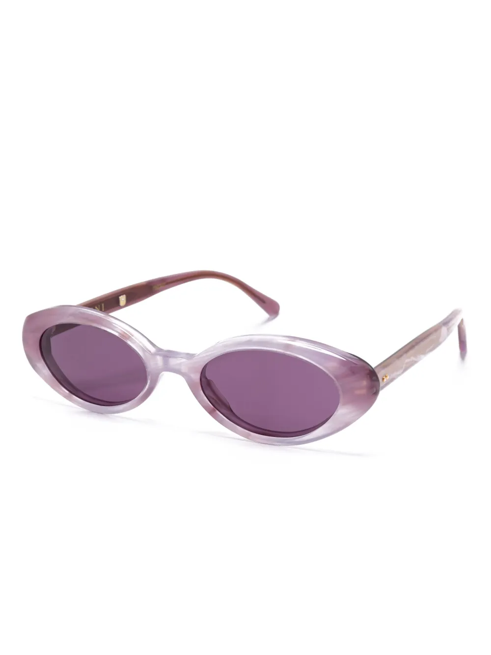 lila acetaat ovalen montuur paarse glazen rechte pootjes gebogen uiteinden Deze bril wordt verkocht met een beschermhoes.