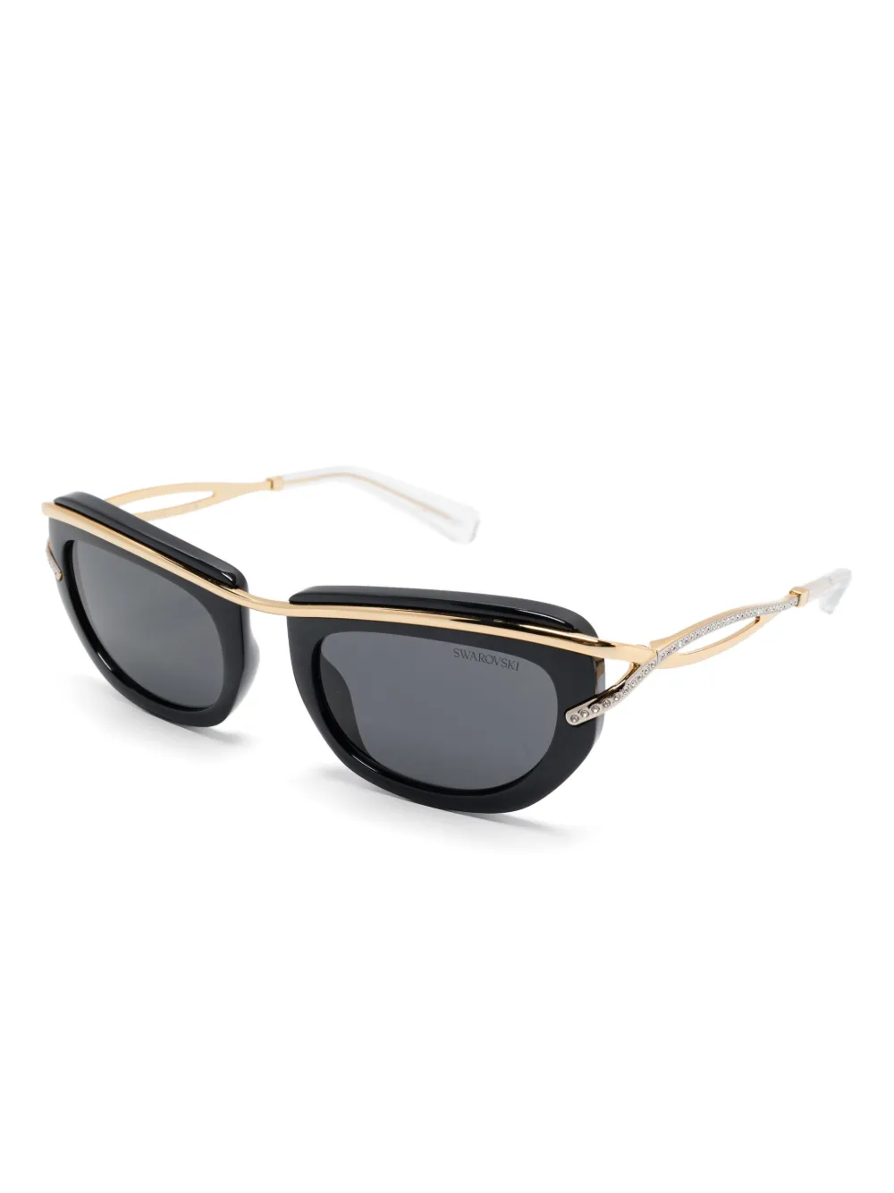 zwart glanzende afwerking metallic finish rechthoekig montuur gekleurde glazen glazen met UV-bescherming verhoogde neusbrug Swarovski kristallen details rechte pootjes doorzichtig vlakdetail tips met gegraveerd logo neuskussentjes Deze bril wordt verkocht met een beschermhoes.