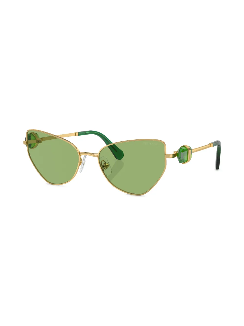 Goudkleurig, appelgroen, metaal, metallic effect, cat-eye montuur, groengetinte glazen, glazen met UV-bescherming, verfraaid met Swarovski-kristallen, goudkleurig materiaal, rechte pootjes en gebogen uiteinde. Deze bril wordt verkocht met een beschermhoes..