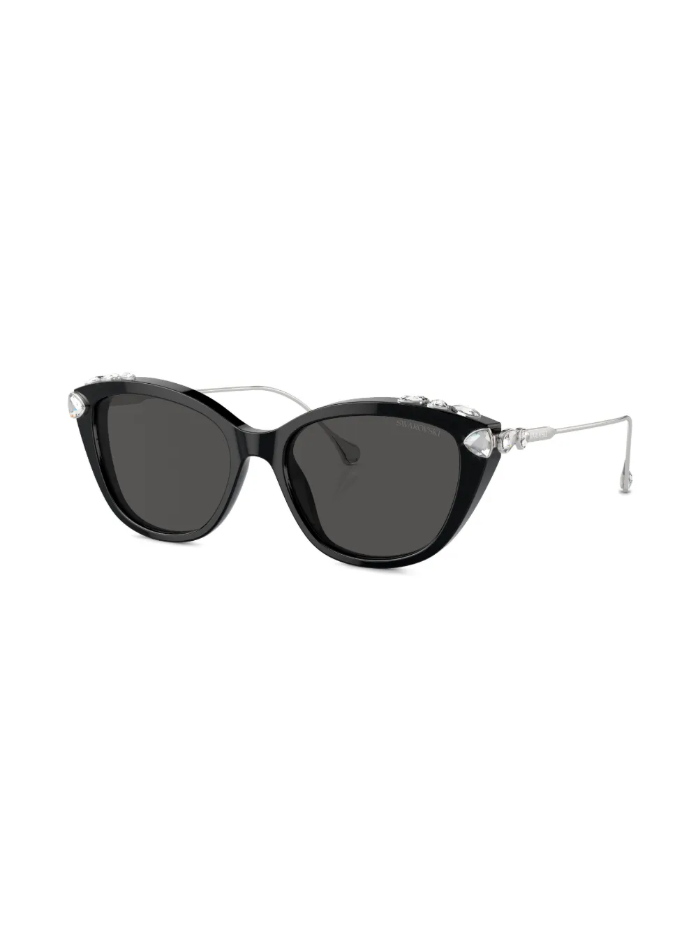 Zwart, acetaat, verfraaid met kristallen, cat-eye montuur, gekleurde glazen, pootje met gegraveerd logo, rechte pootjes en gebogen uiteinde. Deze bril wordt verkocht met een beschermhoes..