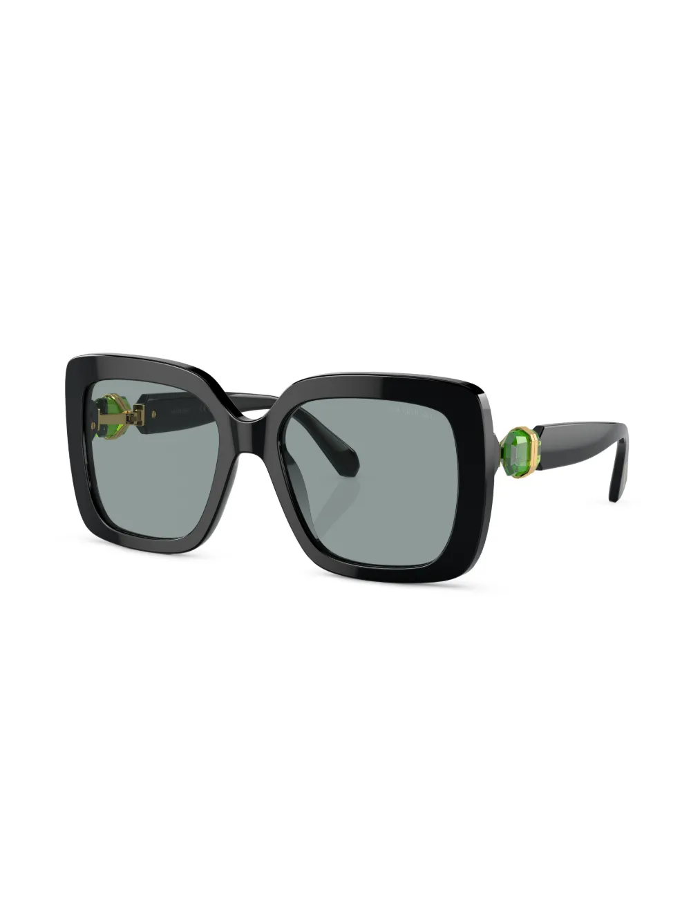 Zwart, acetaat, glanzende afwerking, oversized montuur, grijze glazen, glazen met UV-bescherming, verfraaid met Swarovski-kristallen, goudkleurig materiaal, geschulpte pootjes en gebogen uiteinde.
