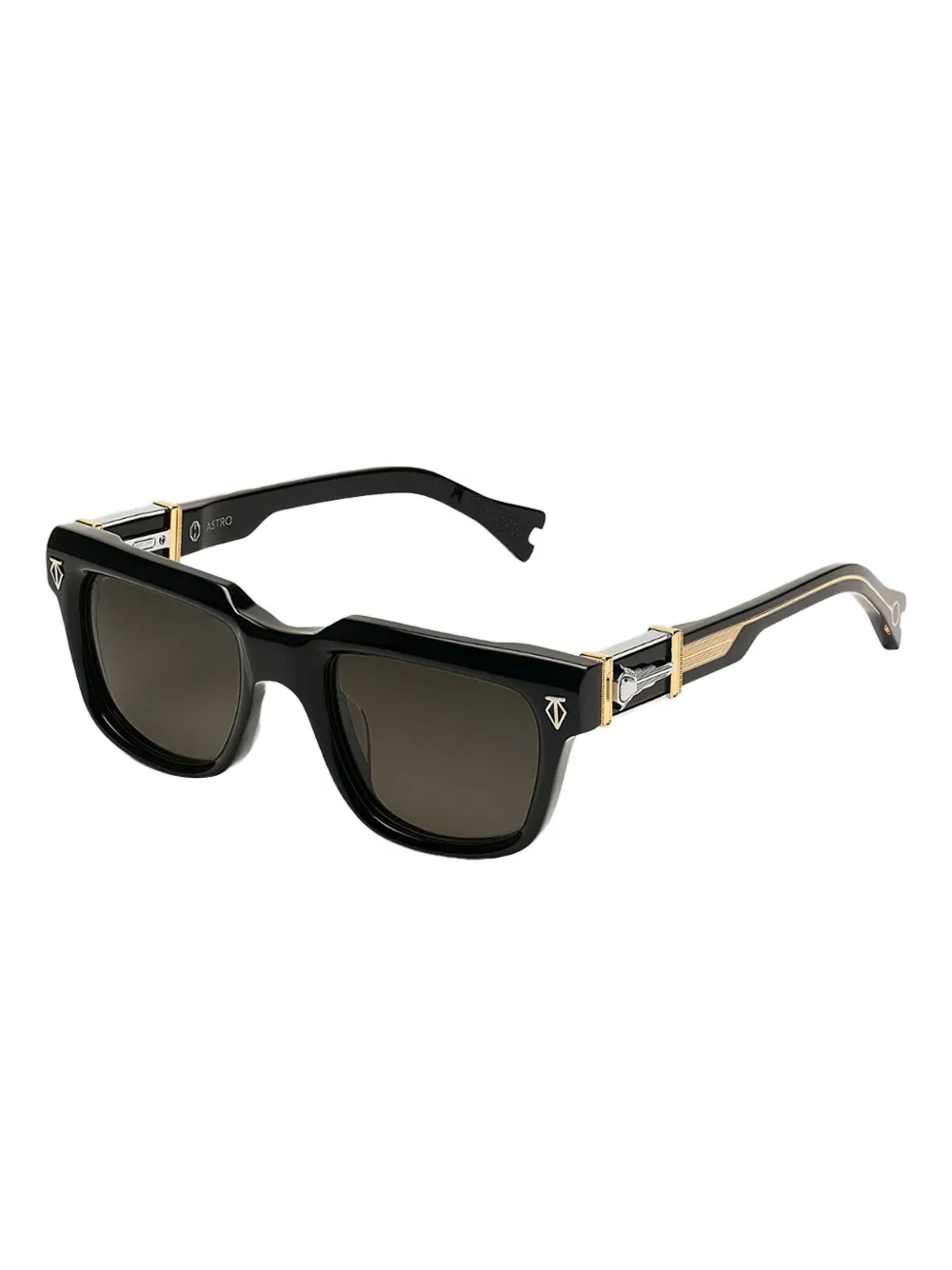 zwart vierkant montuur goudkleurige details sleutelvormig detail bruine glazen details op de pootjes Deze bril wordt verkocht met een beschermhoes.