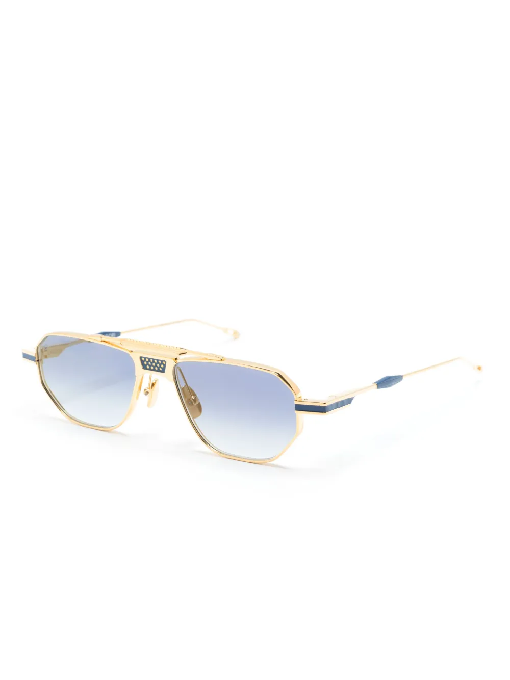 Goudkleurig, titanium, blauwe glazen, glazen met UV-bescherming, kleurverloop, vierkant montuur, verhoogde neusbrug, rechte pootjes en gebogen uiteinde. Deze bril wordt verkocht met een beschermhoes..