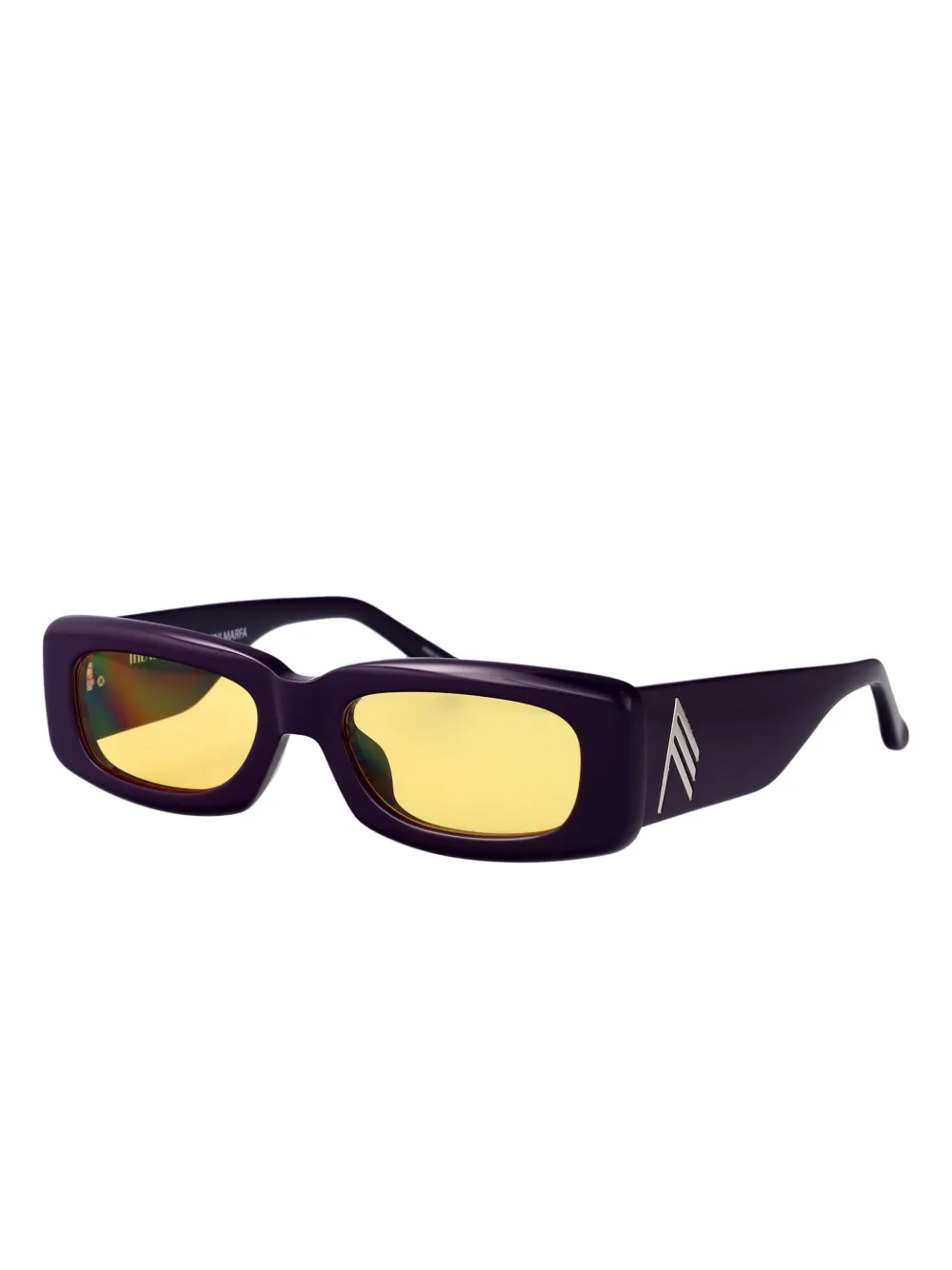 paars vierkant montuur gele glazen strak modern design logodetail aan de zijkant Brede tempels Deze bril wordt verkocht met een beschermhoes.