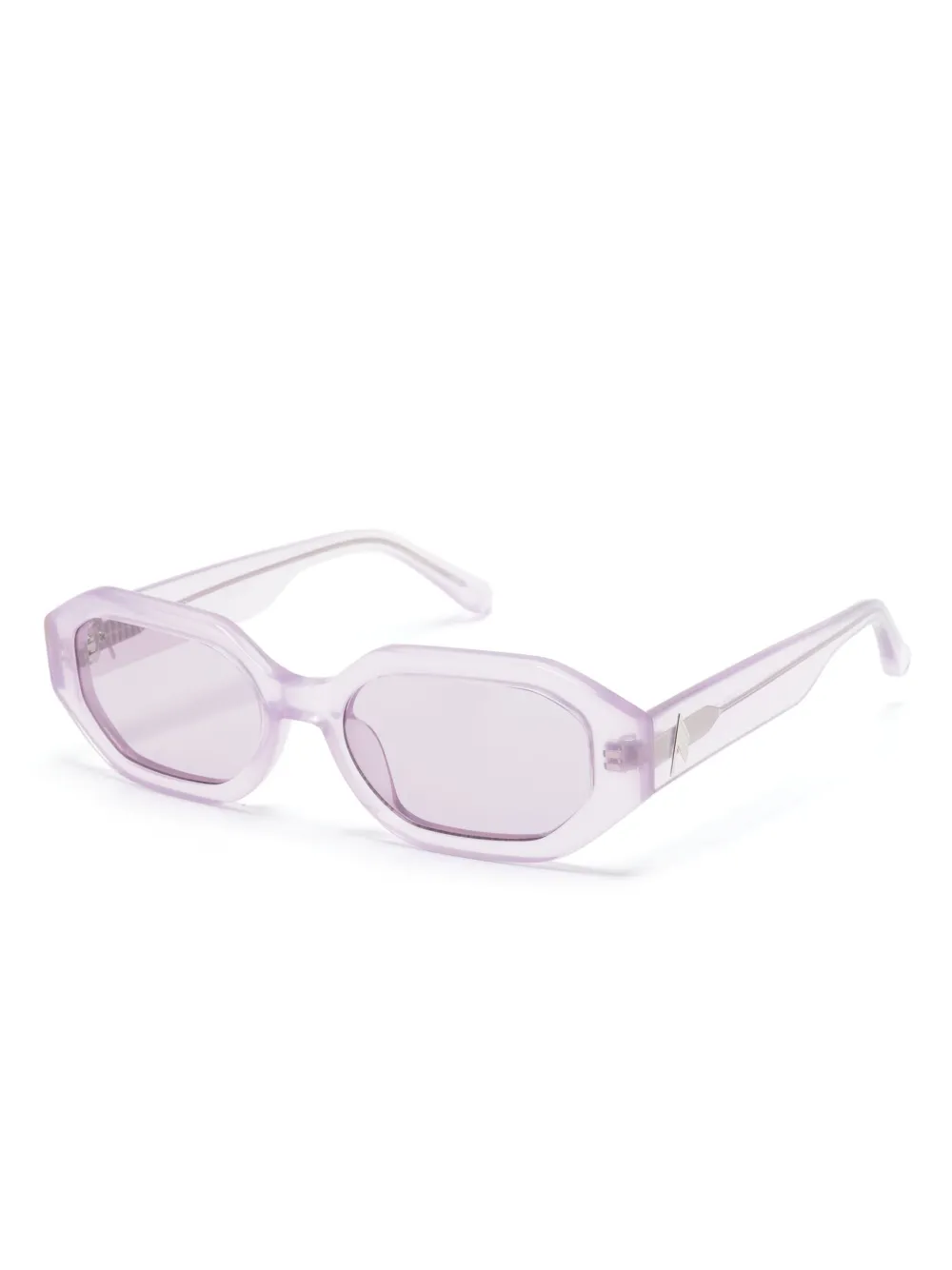 lila acetaat geometrisch montuur paarse glazen doorzichtig design logoplakkaat op het pootje rechte pootjes gebogen uiteinden Deze bril wordt verkocht met een beschermhoes.