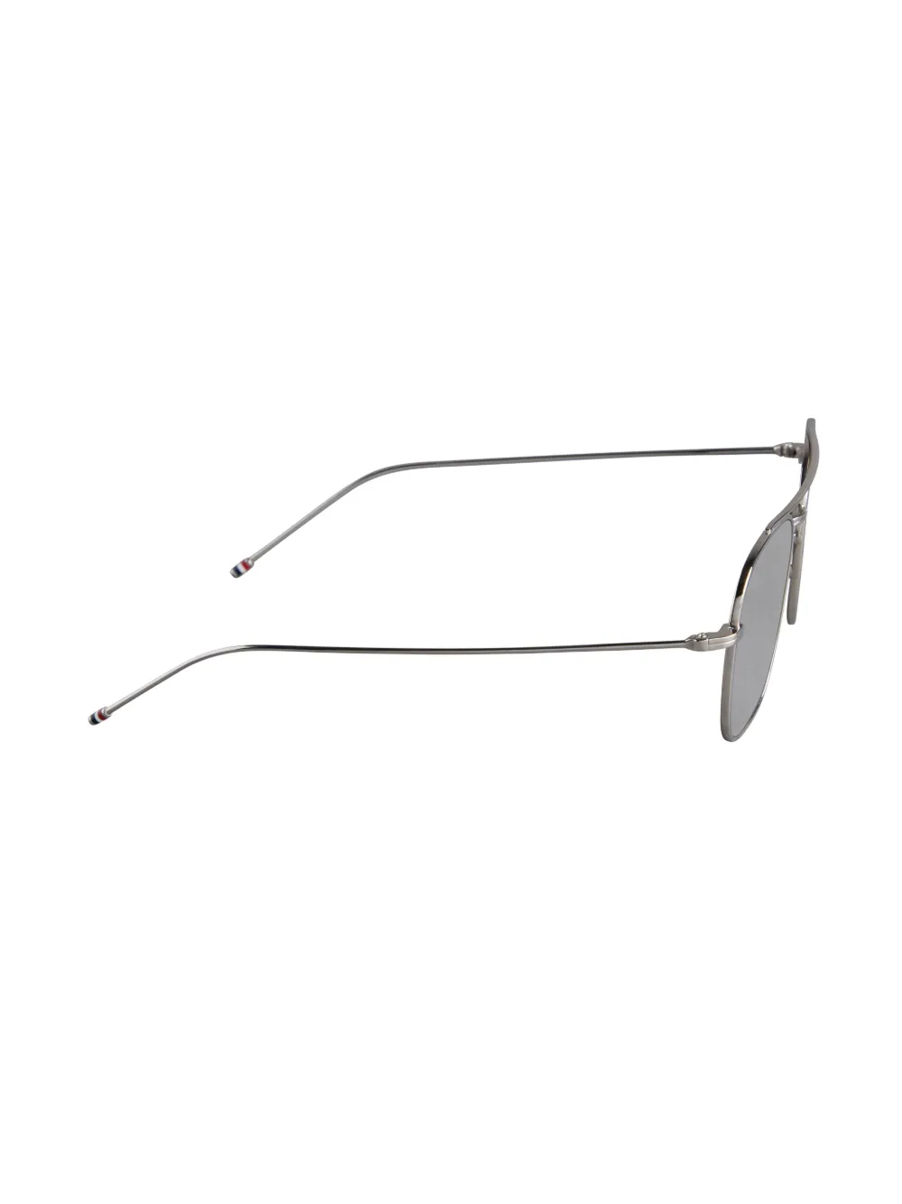 Zilverkleurig, metaal, piloten montuur, gepolijste afwerking, grijze glazen, glazen met UV-bescherming, metalen staaf bij de wenkbrauwen, neuskussentjes, rechte pootjes en gebogen uiteinde. Deze bril wordt verkocht met een beschermhoes..