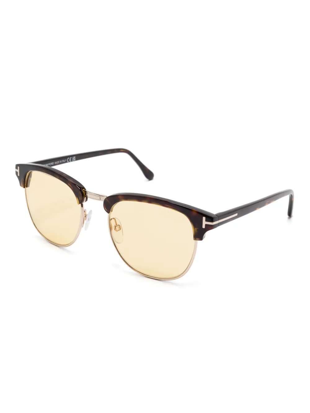 bruin schildpad montuur vierkant montuur design met half montuur gele glazen neuskussentjes T-vormig scharnierdetail rechte pootjes gebogen uiteinden Deze bril wordt verkocht met een beschermhoes.