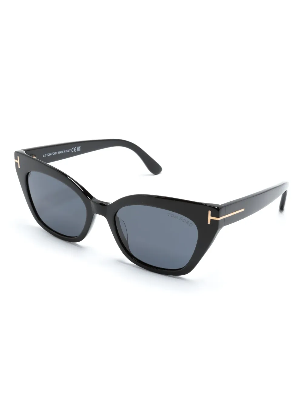 Zwart, acetaat, logoprint op de voorkant, goudkleurig materiaal, cat-eye montuur en gekleurde glazen.