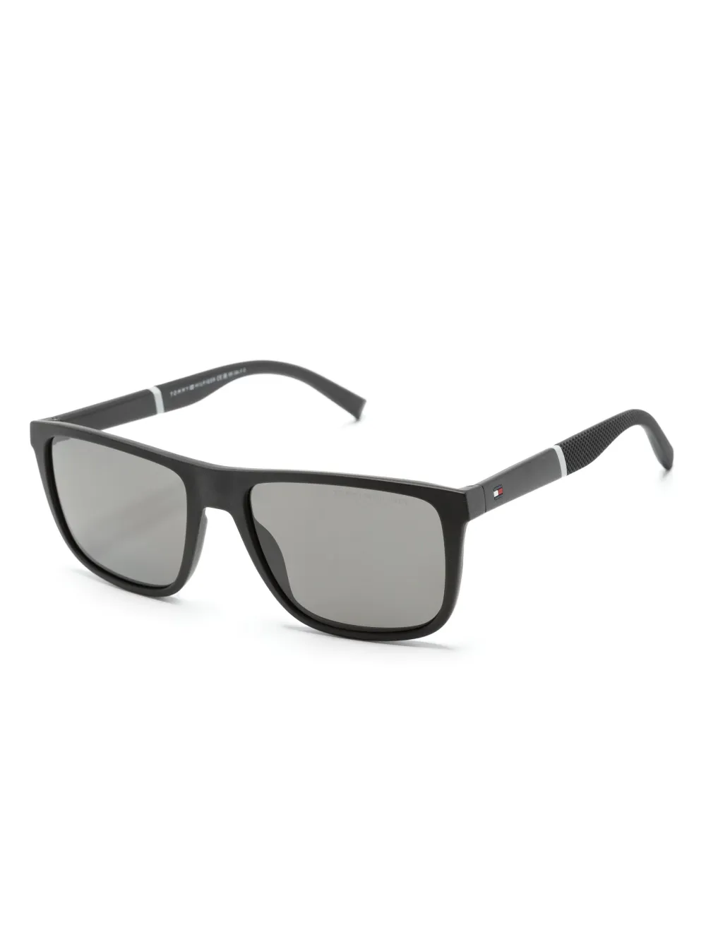 gitzwart acetaat matte afwerking logo bedrukt pootje vierkant montuur grijze glazen glazen met UV-bescherming verhoogde neusbrug neuskussentjes rechte pootjes gebogen uiteinden met textuur Deze bril wordt verkocht met een beschermhoes.