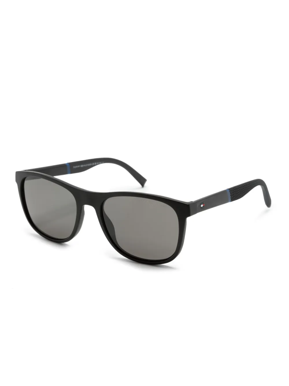 zwart acetaat matte afwerking getextureerde afwerking lens sticker logo bedrukt pootje vierkant montuur grijze glazen glazen met UV-bescherming rechte pootjes gebogen uiteinde Deze bril wordt verkocht met een beschermhoes.