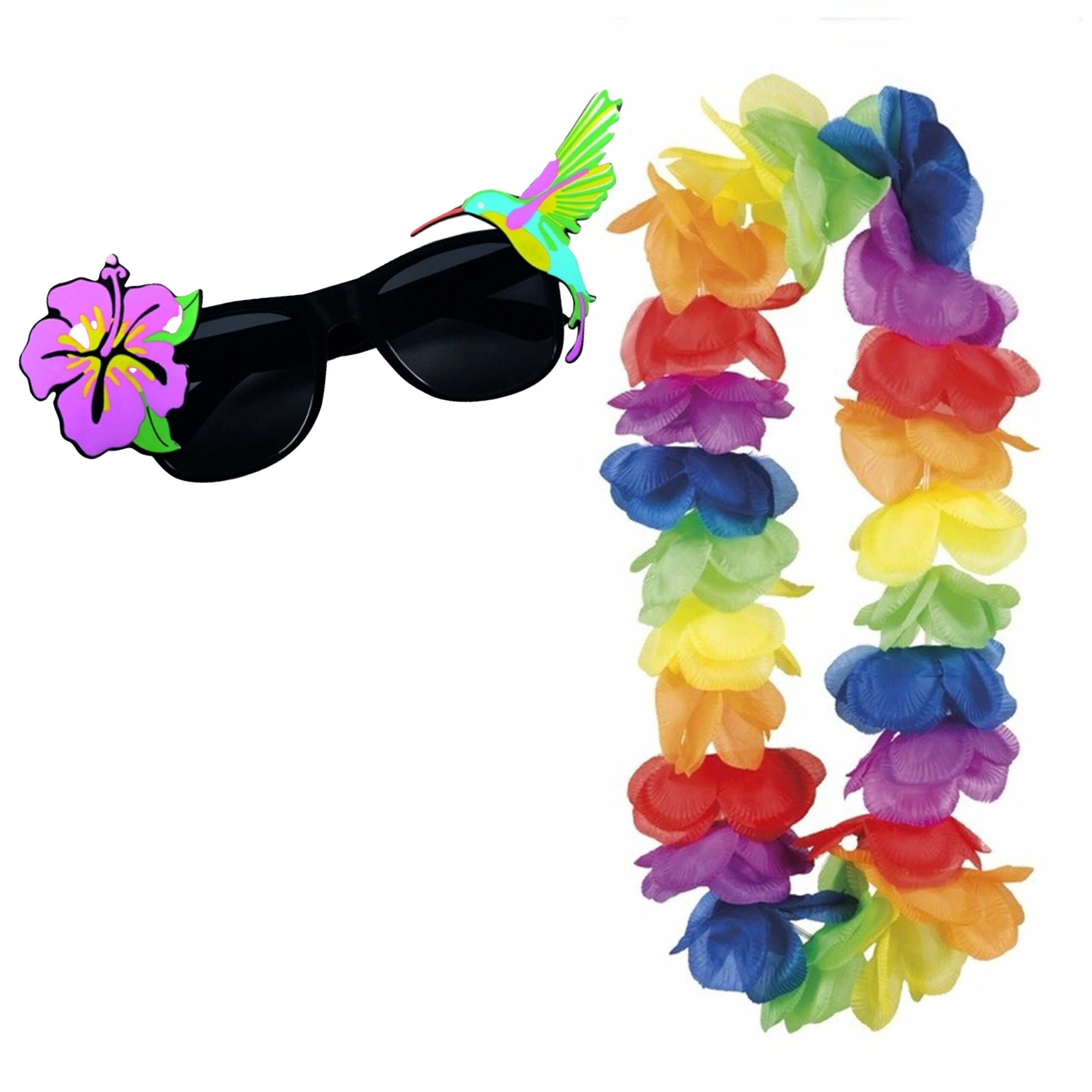 Verkleed accessoires set voor een tropische Hawaii beach feest/party, bestaande uit een kolibri/bloem zonnebril en een bloemenslinger/bloemenkrans inmulti kleuren. Met veel mooie bloemen. Voor dames. Een mooie kleurrijke feestkleding accessoires set. Thema: Tropical party, Hawaii feestje, Summer beach party, Toppers in concert. Voeg enkel nog lichte kleding en leuke sieraden toe voor een optimaal resultaat. Het feest kan beginnen.