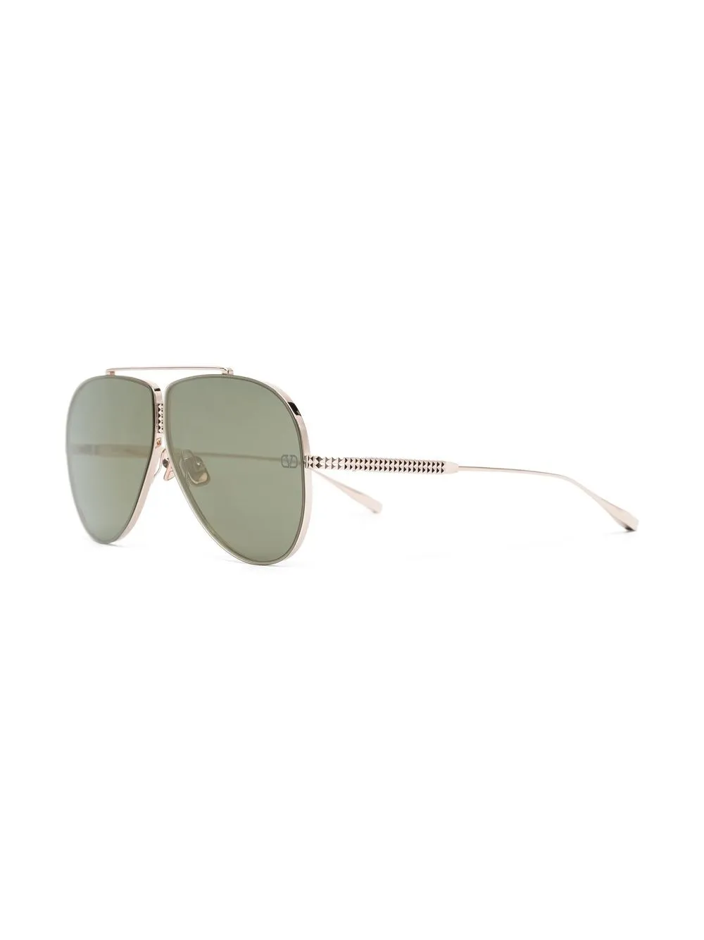 Goudkleurig, titanium, piloten montuur, gekleurde glazen, neuskussentjes, UV-bescherming, rechte pootjes, gebogen uiteinde en goudkleurige rockstud-details. Deze bril wordt verkocht met een beschermhoes..