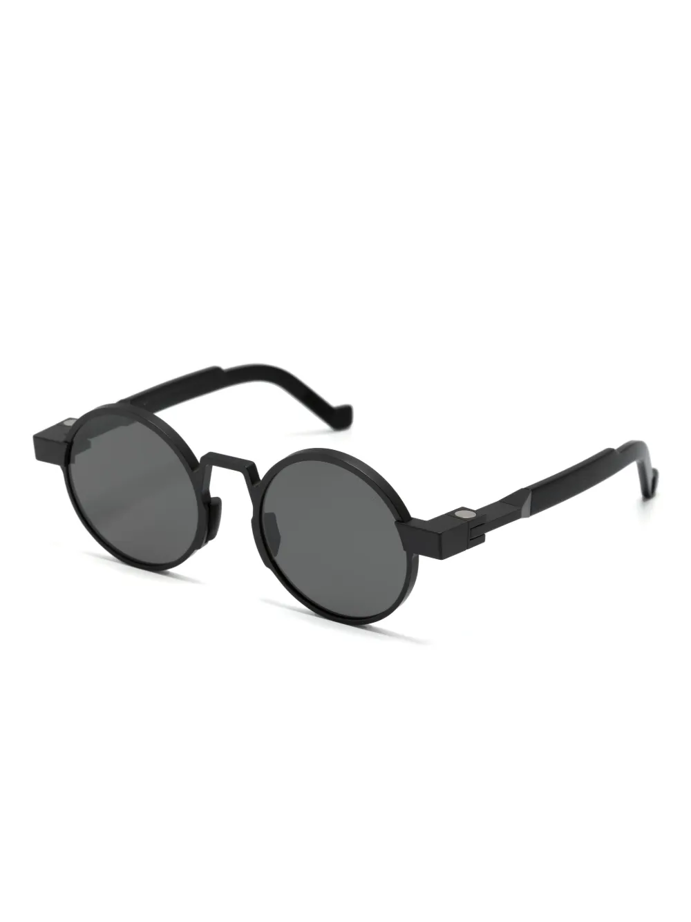 Zwart, acetaat, rond montuur, grijze glazen, rechte pootjes en gebogen uiteinde. Deze bril wordt verkocht met een beschermhoes..
