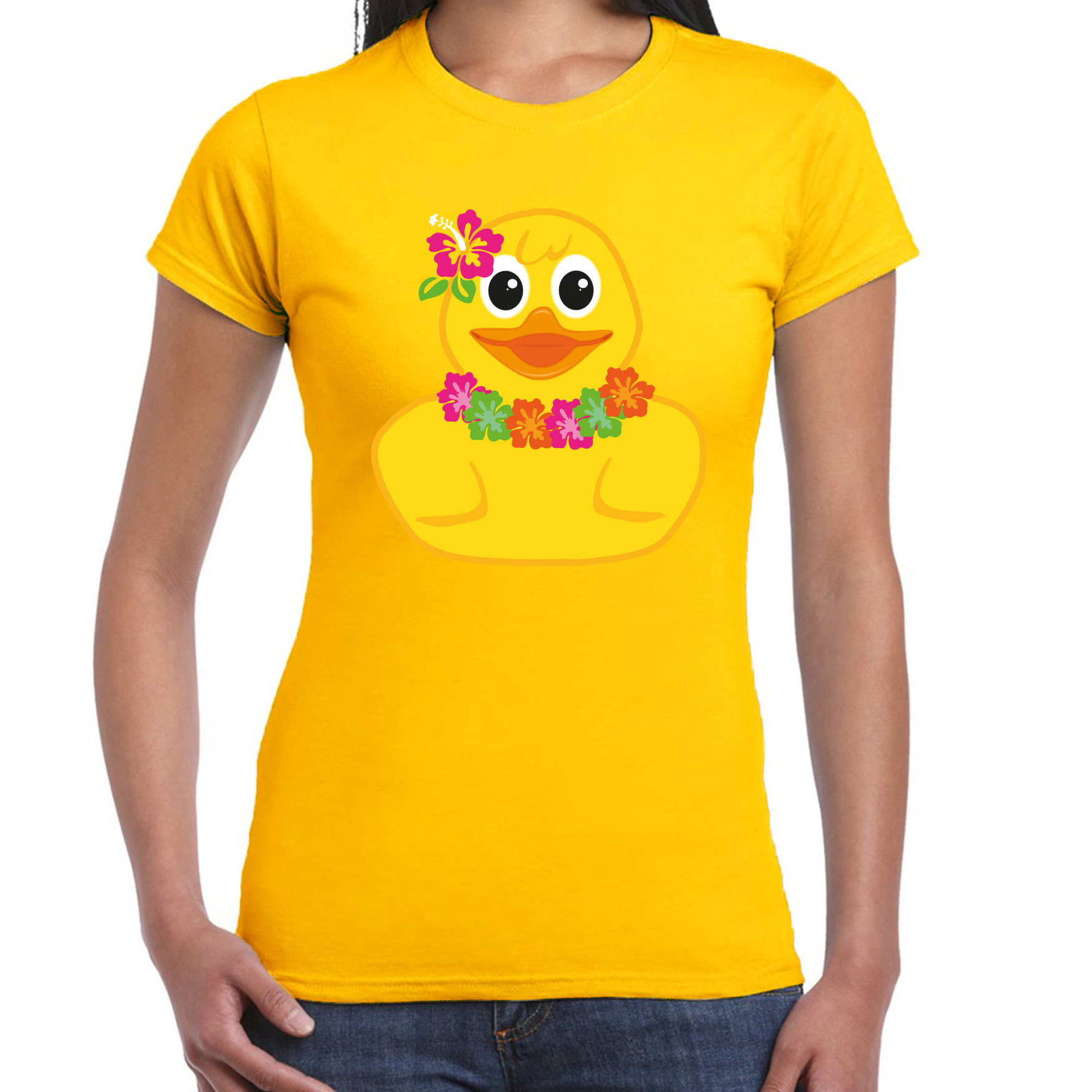 Zon aan, muziek aan ? dit gele verkleed T-shirt voor dames met badeend in tropical stijl is jouw toegangsbewijs tot een feestje vol foute gezelligheid! Of je nu op een tropisch themafeest verschijnt, de polonaise leidt tijdens carnaval of gewoon zin hebt in een outfit met een flinke knipoog: dit shirt brengt meteen de juiste vibe. Met z?n zonnige uitstraling en tropische badeend-print is dit T-shirt een echte sfeermaker. Het zit lekker, valt op en is precies fout genoeg om helemaal goed te zijn. Combineer ?m met een zonnebril, bloemenkrans of opblaasflamingo en je bent er helemaal klaar voor! Materiaal: 145 grams, 100% katoen. Merk: Bellatio Decorations.