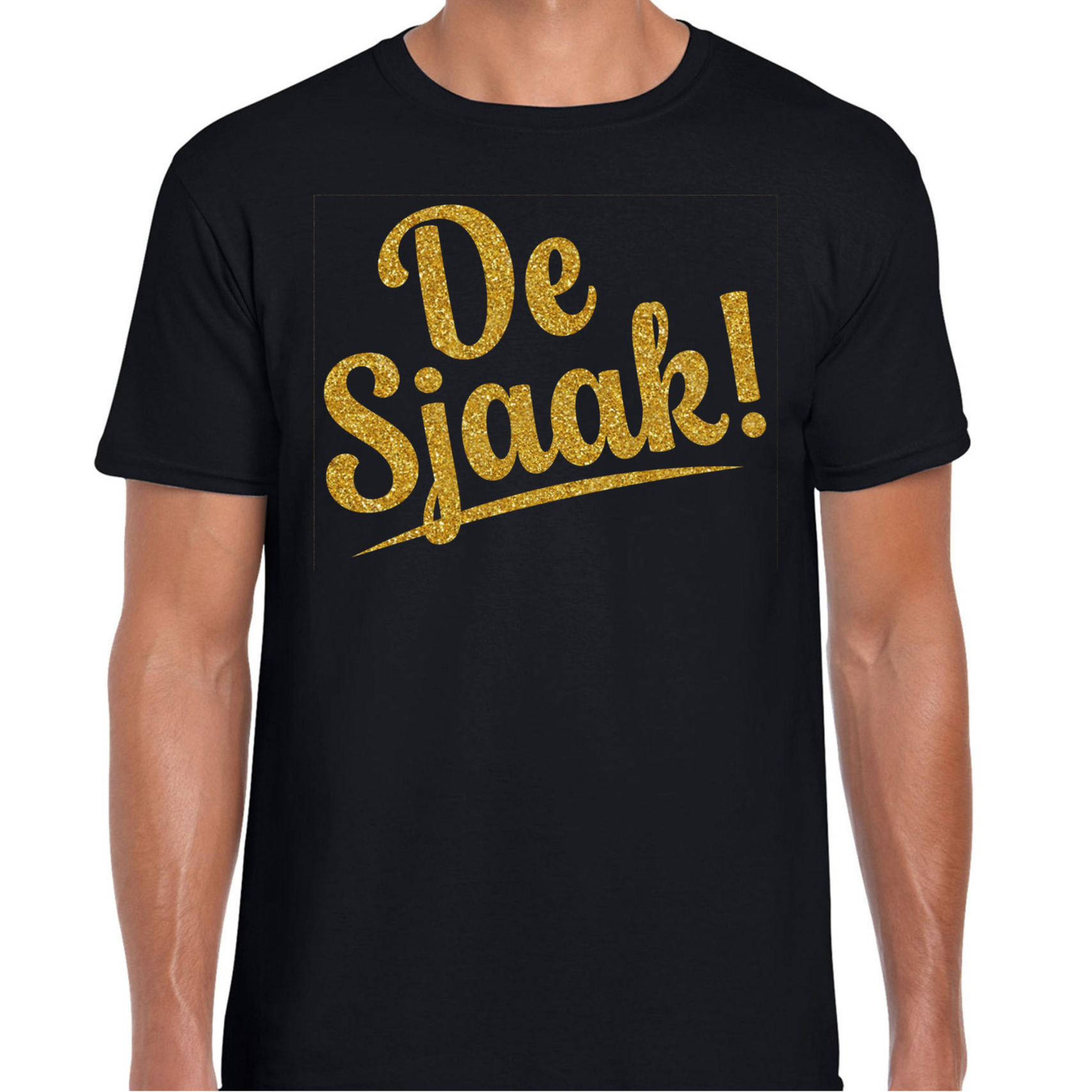 Geef je foute party de juiste dosis humor met dit T-shirt voor heren! Het zwarte T-shirt met de tekst “De Sjaak!” in glittergoud is de perfecte keuze voor wie van een flinke dosis fun houdt. Het glinsterende goud trekt de aandacht, terwijl de tekst zorgt voor een lach op ieders gezicht. Of je nu de show steelt of gewoon lekker wilt lachen, met dit T-shirt ben jij gegarandeerd de ster van de avond. Klaar om “De Sjaak” te zijn op de foute party? “Met dit T-shirt ben jij de glitter en glamour op de foute party, klaar om de show te stelen!”. Materiaal: 145 grams, 100% katoen. Merk: Bellatio Decorations.