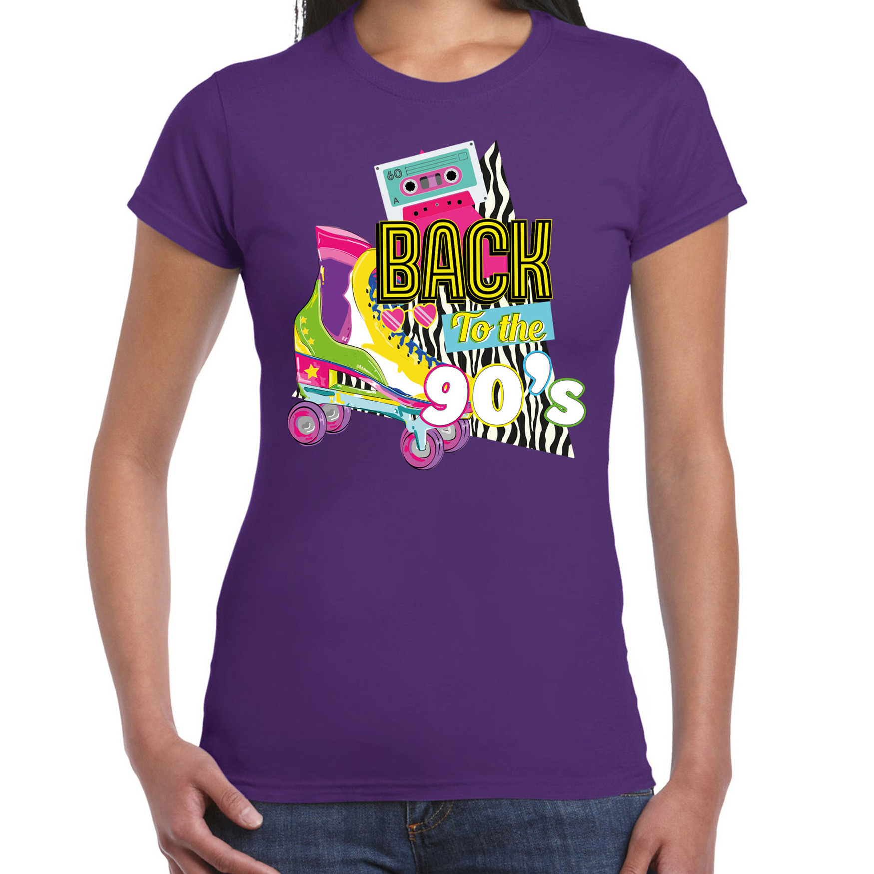 Verkleed t-shirt voor dames in de kleur paars. Dit leuke t-shirt is bedrukt met de tekst: Back to the 90s. De tekst is vrolijk gekleurd en er achter staat een print met een rolschaats, zonnebril en cassettebandje. Heb jij binnenkort een foute party, carnaval of een jaren 90/90s thema feestje? Dan is dit T-shirt onmisbaar! Het shirt is ook leuk om cadeau te geven of te dragen tijdens het uitgaan/stappen. Materiaal: 145 grams, 100% katoen. Merk: Bellatio Decorations.