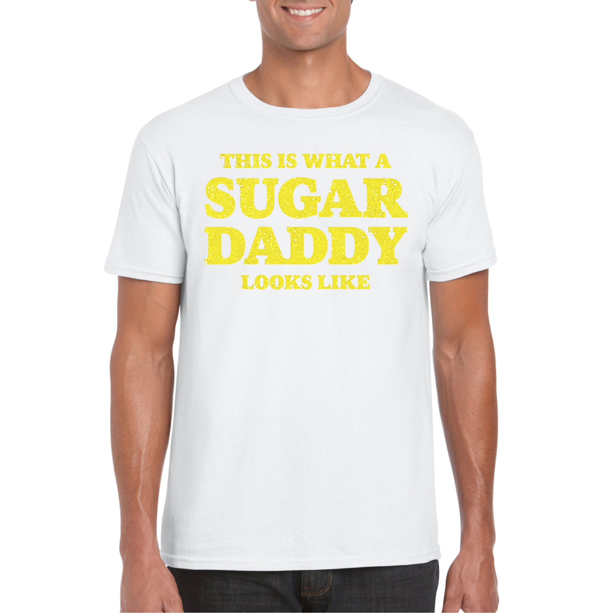 Verkleed T-shirt voor heren in de kleur wit met glitter opdruk in de kleur geel. Dit leuke T-shirt is bedrukt met de tekst: This is What a sugar daddy Looks Like. Heb jij binnenkort een foute party, carnaval of een ander glitter en glamour feestje? Dan is dit T-shirt onmisbaar! Het shirt is ook leuk om cadeau te geven aan bijvoorbeeld je vader of te dragen tijdens het uitgaan/stappen. Materiaal: 145 grams, 100% katoen. Merk: Bellatio Decorations.
