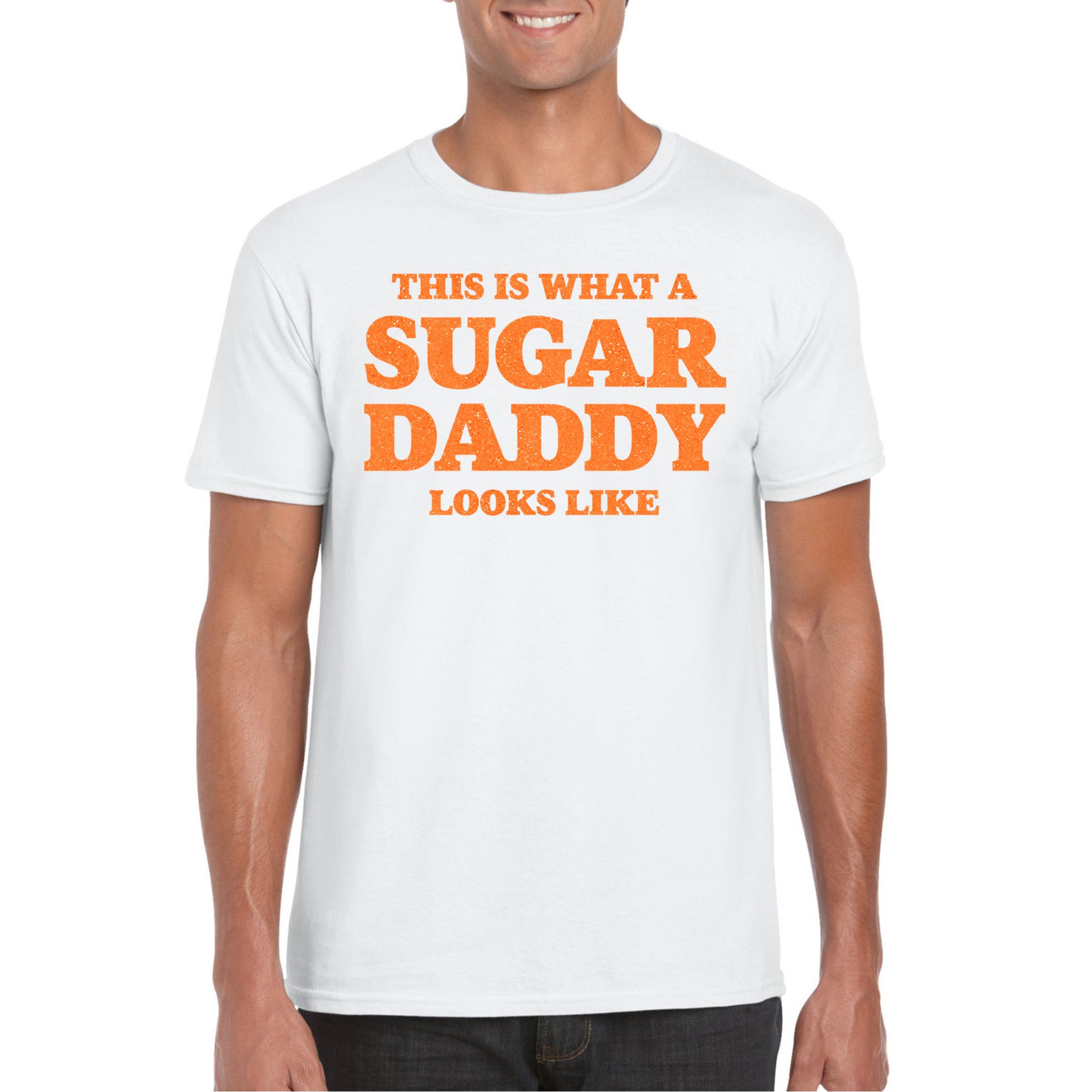 Verkleed T-shirt voor heren in de kleur wit met glitter opdruk in de kleur oranje. Dit leuke T-shirt is bedrukt met de tekst: This is What a sugar daddy Looks Like. Heb jij binnenkort een foute party, carnaval of een ander glitter en glamour feestje? Dan is dit T-shirt onmisbaar! Het shirt is ook leuk om cadeau te geven aan bijvoorbeeld je vader of te dragen tijdens het uitgaan/stappen. Materiaal: 145 grams, 100% katoen. Merk: Bellatio Decorations.