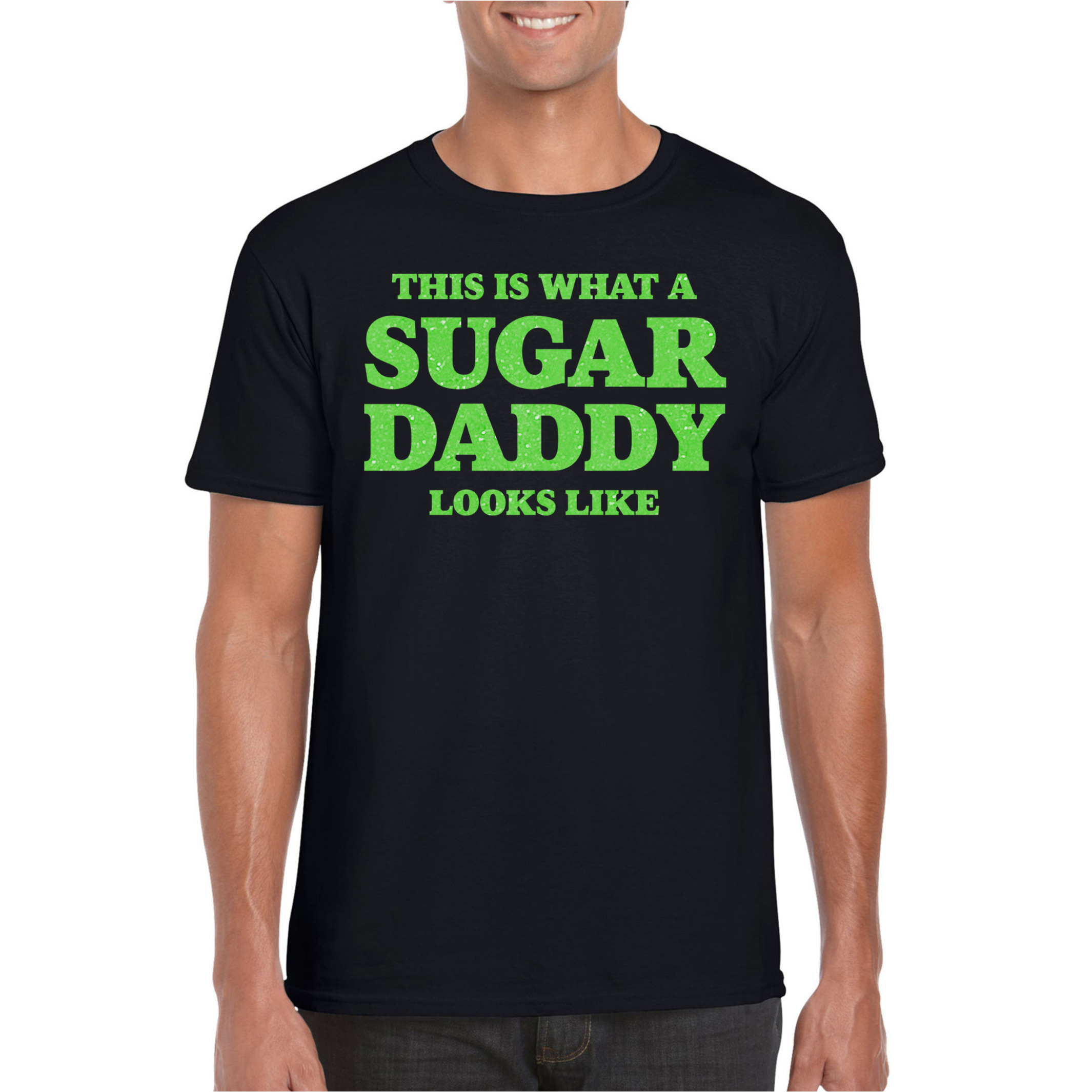 Verkleed T-shirt voor heren in de kleur zwart met glitter opdruk in de kleur groen. Dit leuke T-shirt is bedrukt met de tekst: This is What a sugar daddy Looks Like. Heb jij binnenkort een foute party, carnaval of een ander glitter en glamour feestje? Dan is dit T-shirt onmisbaar! Het shirt is ook leuk om cadeau te geven aan bijvoorbeeld je vader of te dragen tijdens het uitgaan/stappen. Materiaal: 145 grams, 100% katoen. Merk: Bellatio Decorations.