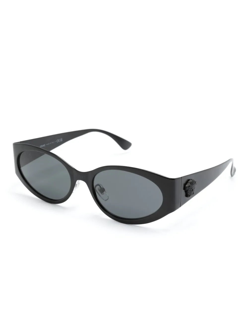 zwart metaal matte afwerking ovaal montuur grijze glazen neuskussentjes Medusa Head plakkaat op de arm Bewerkte pootjes met gebogen uiteinden Deze bril wordt verkocht met een beschermhoes.