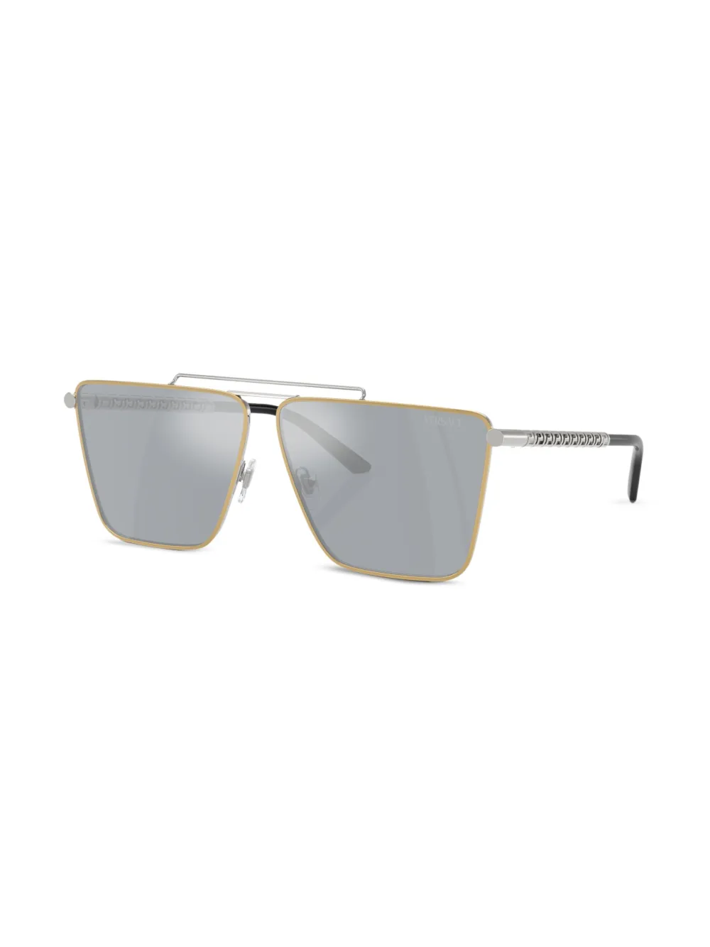 goudkleurig/zilverkleurig metaal vierkant montuur gespiegelde glazen glazen met UV-bescherming dubbele neusbrug neuskussentjes rechte pootjes gebogen uiteinden Deze bril wordt verkocht met een beschermhoes.