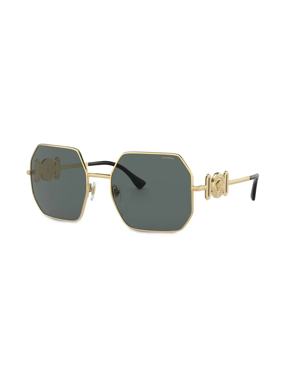 Goudkleurig, metaal, geometrisch montuur, groengetinte glazen, Medusa detail, reliëf detail, neuskussentjes, geschulpte pootjes en gebogen uiteinde. Deze bril wordt verkocht met een beschermhoes..
