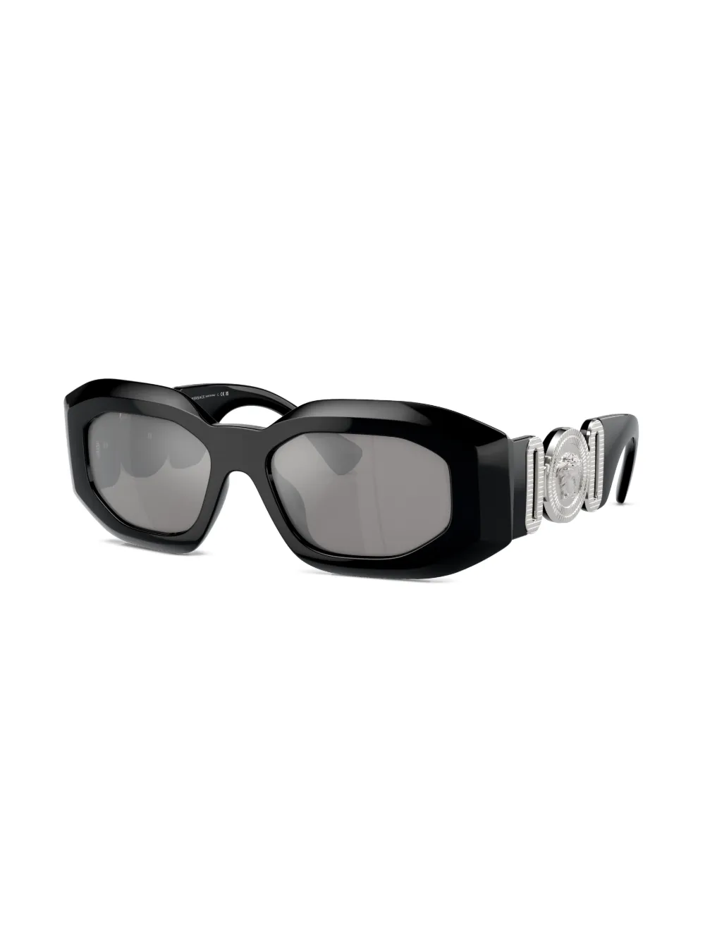 Zwart, acetaat, rechthoekig montuur, grijze glazen, Medusa detail, geschulpte pootjes en gebogen uiteinde. Deze bril wordt verkocht met een beschermhoes..