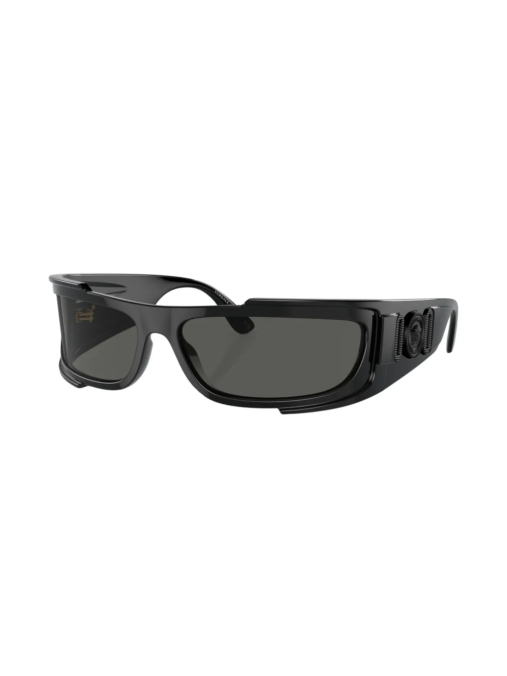 Zwart, acetaat, grijze glazen, rechthoekig montuur, Medusa patroon, effen logoplakkaat, oversized pootjes en gebogen uiteinde. Deze bril wordt verkocht met een beschermhoes..