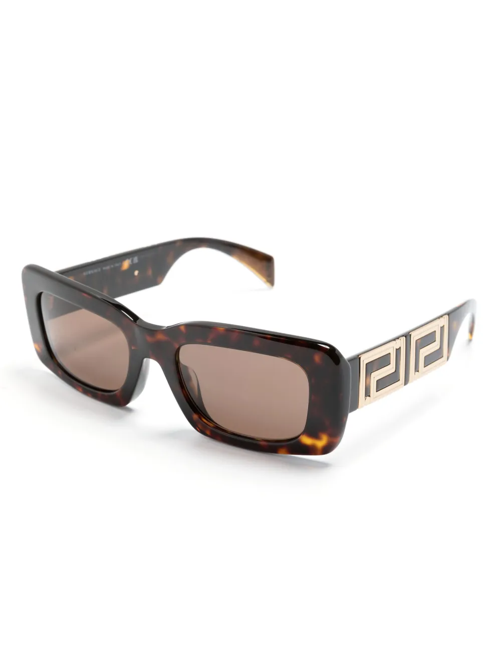 Bruin, acetaat, schildpad montuur, bruine glazen, vierkant montuur, logoplakkaat op het pootje, rechte pootjes en gebogen uiteinde. Deze bril wordt verkocht met een beschermhoes..