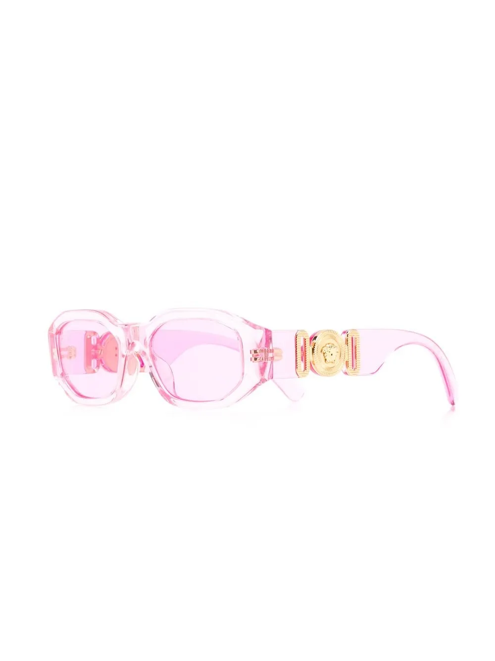 Rose roze, Medusa detail, vierkant montuur, doorzichtig montuur, roze glazen en glazen met UV-bescherming. Deze bril wordt verkocht met een beschermhoes..