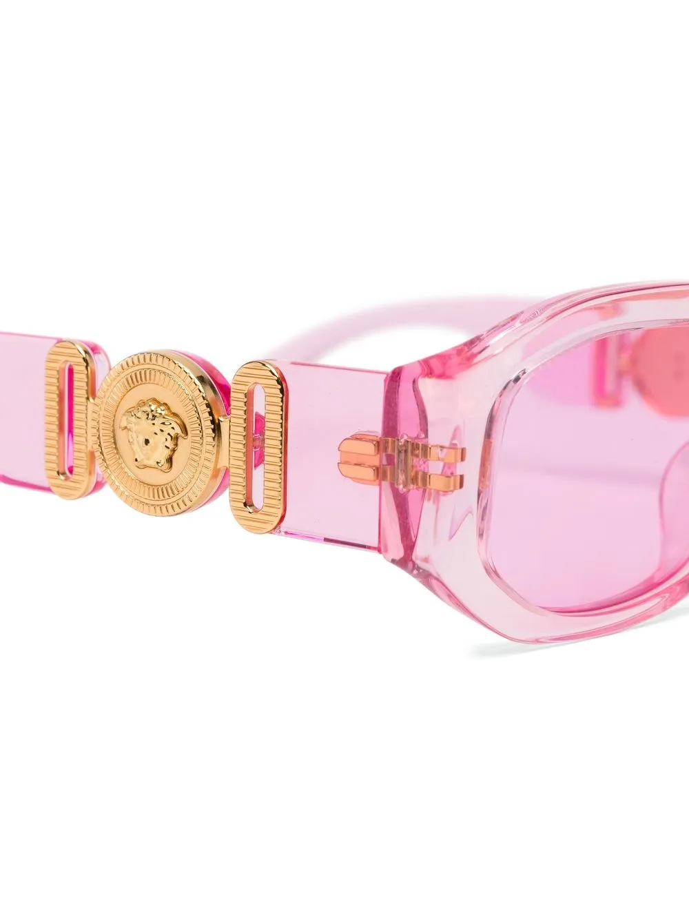 Roze, acetaat, Medusa detail, roze glazen, rechthoekig montuur, roze glazen, rechte pootjes en gebogen uiteinde. Deze bril wordt verkocht met een beschermhoes..