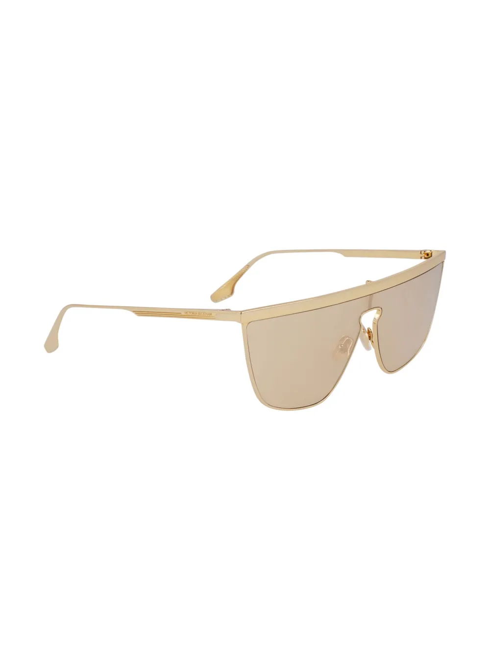 goudkleurig metaal shield montuur roze glazen neuskussentjes gebogen uiteinden pootje met gegraveerd logo Deze bril wordt verkocht met een beschermhoes.
