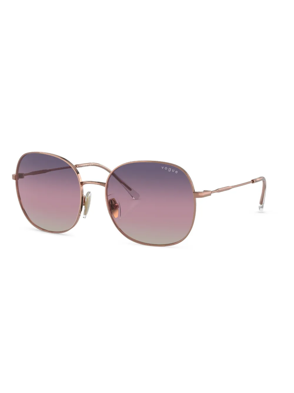 Roségoud, lens sticker, rond montuur, glazen met kleurverloop, neuskussentjes, rechte pootjes en gebogen uiteinde. Deze bril wordt verkocht met een beschermhoes..