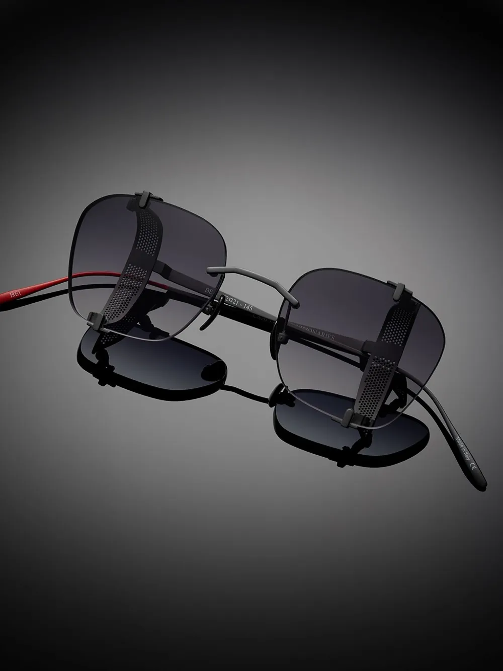 zwart geometrisch montuur rode uiteinden van de pootjes randloze glazen Deze bril wordt verkocht met een beschermhoes.