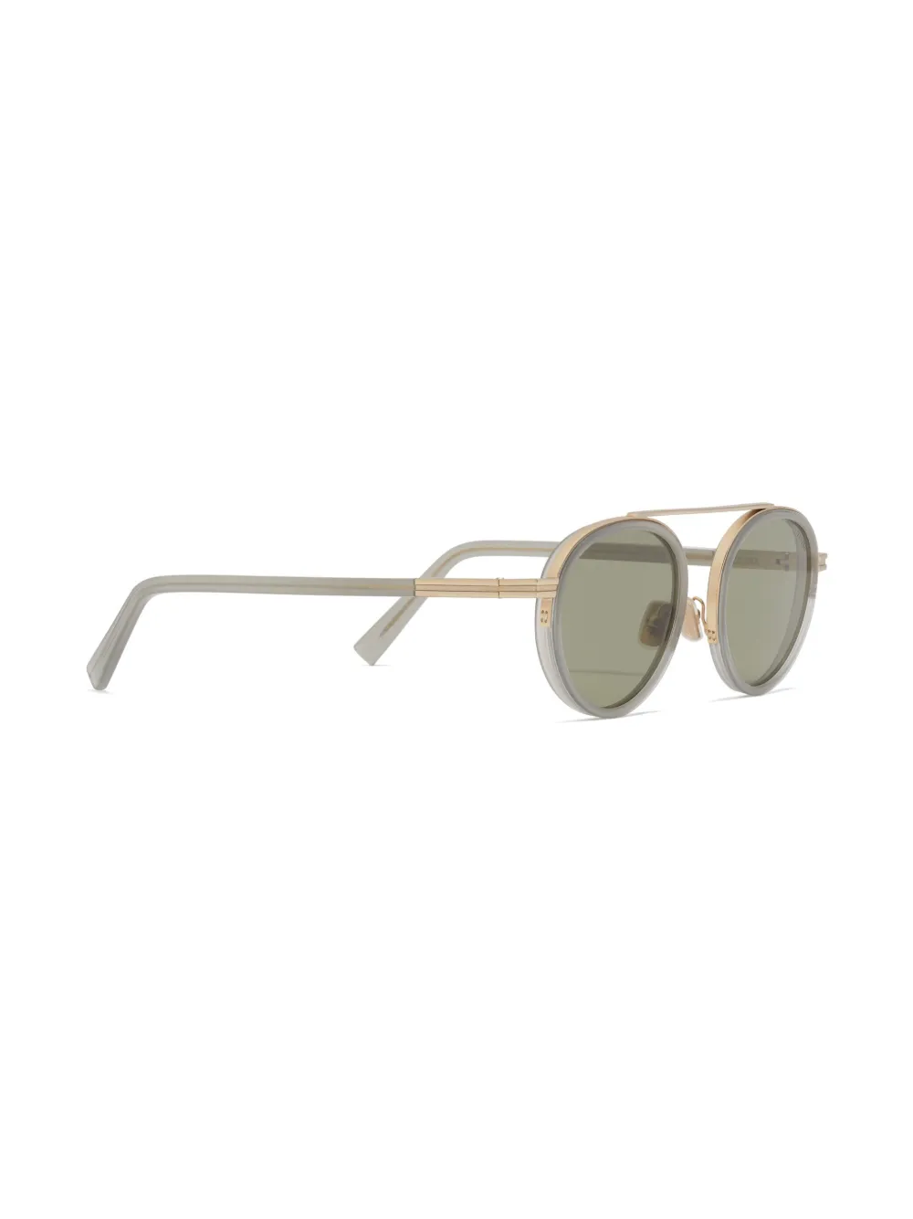 goudkleurig acetaat rond montuur groen getinte glazen neuskussentjes rechte pootjes gebogen uiteinden Deze bril wordt verkocht met een beschermhoes.