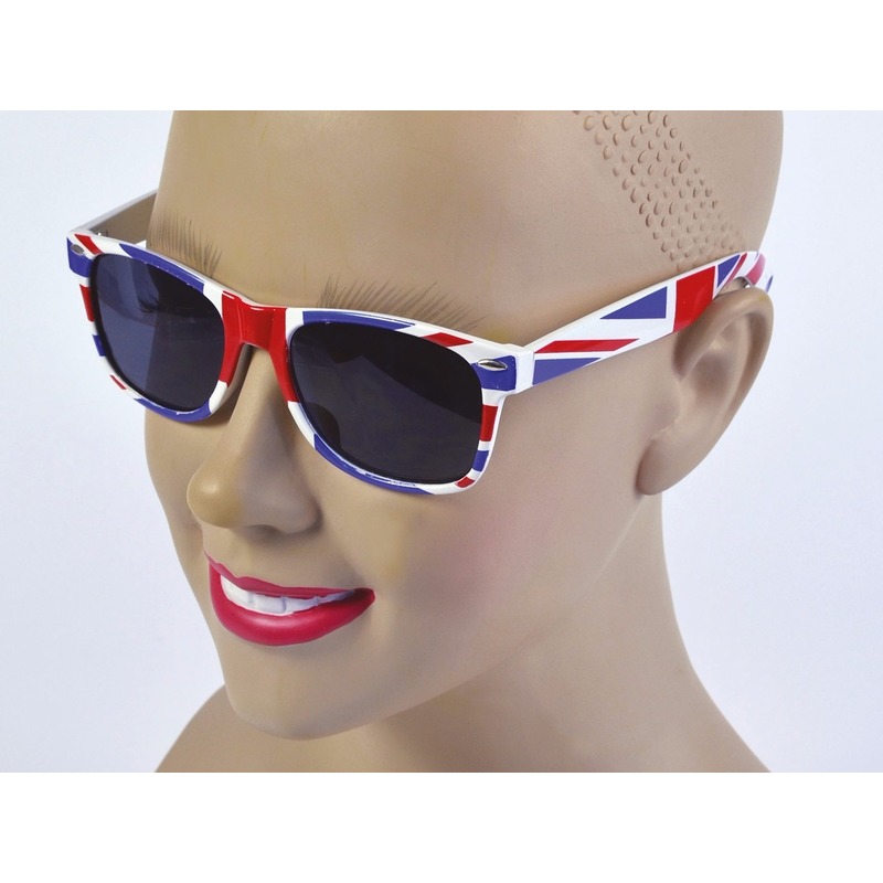 Zonnebril in de Engelse vlag kleuren, Union Jack thema. Hippe zonnebril/verkleed voor volwassenen. Engelse supporters verkleed artikelen. Materiaal: kunststof.
